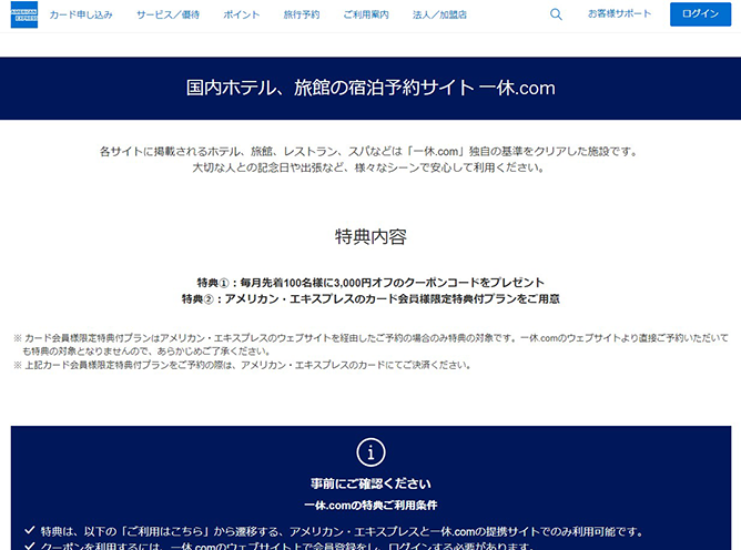 アメックスカード会員は、個人カードかビジネスカードかを問わず、一休.comで利用できる3,000円割引クーポンをもらうことができます。