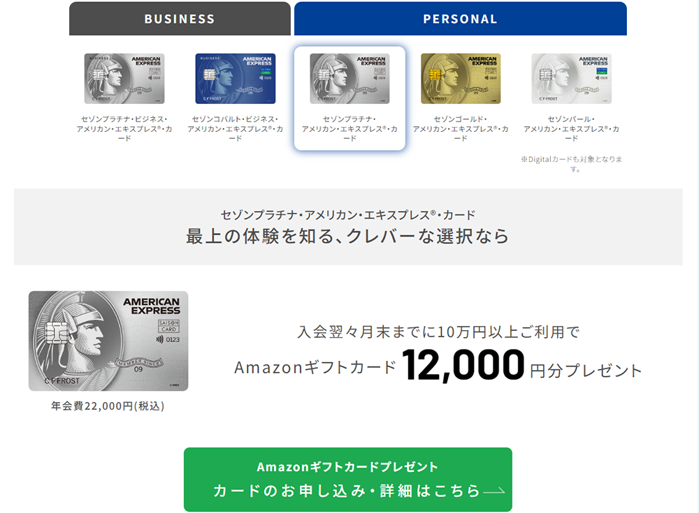 理由は、初年度年会費無料としているのはセゾンプラチナ・ビジネスだけであり、追加カードとしてプライベートカード(個人カード)である「セゾンプラチナ・アメックス」が年会費無料で付帯するから。